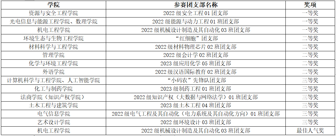 经过激烈的角逐,资源与安全工程学院2022级安全工程01团支部等3个团支部荣获一等奖;环境生态与生物工程学院“红细胞”团支部等5个团支部荣获二等奖;计算机科学与工程学院人工智能学院“小码农”先锋队团支部等6个团支部荣获三等奖;机电工程学院2022级机械设计制造及其自动化03班团支部荣获“最佳人气奖”。