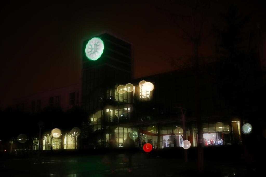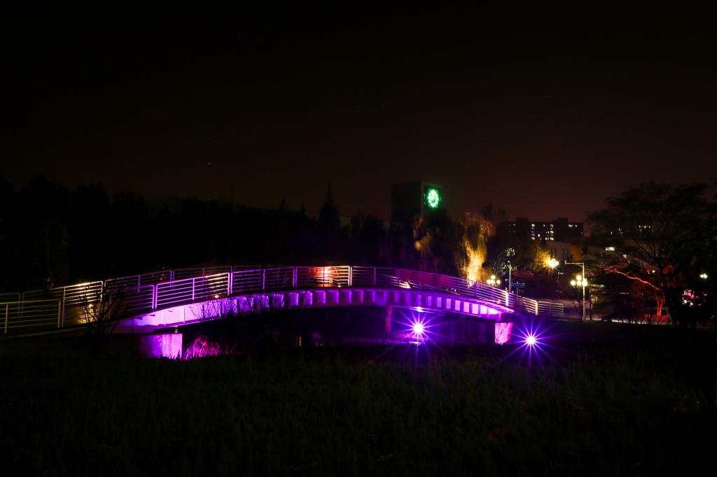 夜幕低低的垂下,我站在工大的路旁,看这华灯初上。城市,像另一天体一样,闪烁地布满无数的小星光。流光婉转,彩色的线条勾勒出路的模样,从南至北穿过美丽的校园。彩虹桥下七彩斑斓,与钟楼那一点绿相呼应。弥散的光不知是发散还是汇集,不变的是同学们认真自习的模样。空荡荡的楼道悄无声息,只见那灯光忽远忽近,变幻莫测,晕出一片朦胧的烟霭。黑夜里,盏盏街灯熠熠闪烁着,像花的蓓蕾在做着盛开的梦,我站在这灯下,看这美景,感受这武工大的气息。