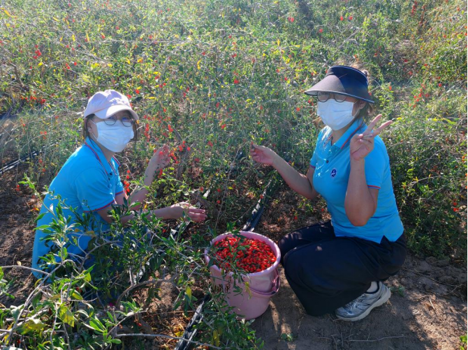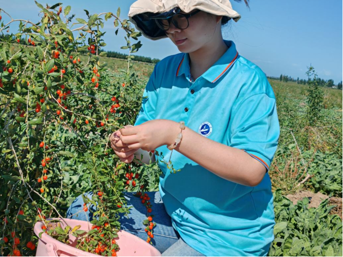 访谈结束后,实践队迅速行动起来,要真正了解杞农们的困境与需求,就必须亲身体验枸杞的生长环境与采摘过程。队员们纷纷穿戴好防晒装备,满怀热情地与杞农们一同投入到紧张的枸杞采摘工作中。在烈日炎炎下,实践队员们挥汗如雨,她们穿梭在茂密的枸杞林间,小心翼翼地采摘着每一颗成熟的枸杞。通过与杞农们的并肩作战,实践队员们更加直观地了解了枸杞的生长环境与采摘过程,亲身体验了采摘枸杞的繁琐与劳累。这些经历让实践队员们更加深刻地认识到了枸杞产业的重要性以及杞农们所面临的困境和挑战。