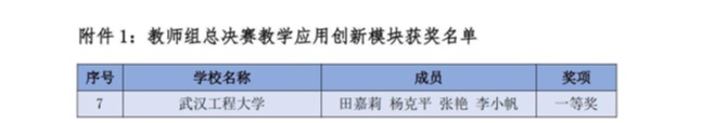 (通讯员 黄炎忠)近日,全国第三届高校数智化商业决策创新大赛教师组全国总决赛获奖结果揭晓,我校法商学院(知识产权学院)教师田嘉莉、杨克平、张艳和李小帆的作品《基于数智化技术的“学问思辨行”教学模式实践——以当代中国经济课程为例》在本次大赛中荣获全国一等奖。