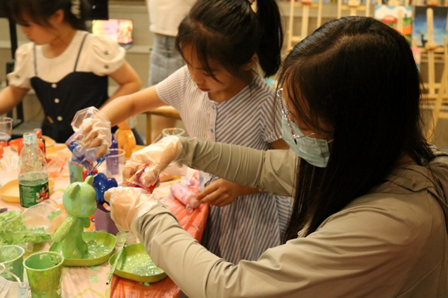 在手工流体熊制作课堂中,参与者们挑选自己喜爱的颜色,将颜料倾倒在小熊上,看着色彩在小熊身上自由流动,形成独特的图案,感受到了色彩变化带来的视觉享受。