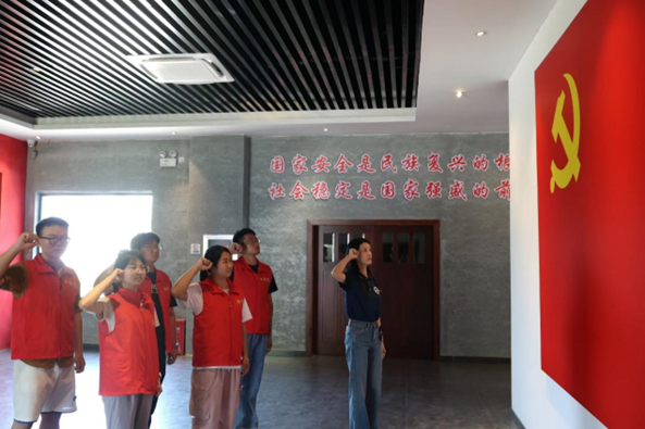 面对入党宣誓墙,实践团的党员同学们在老师的带领下,举起右拳,庄严宣誓,一同重温入党誓词,铿锵有力的宣誓声响彻整个纪念馆。