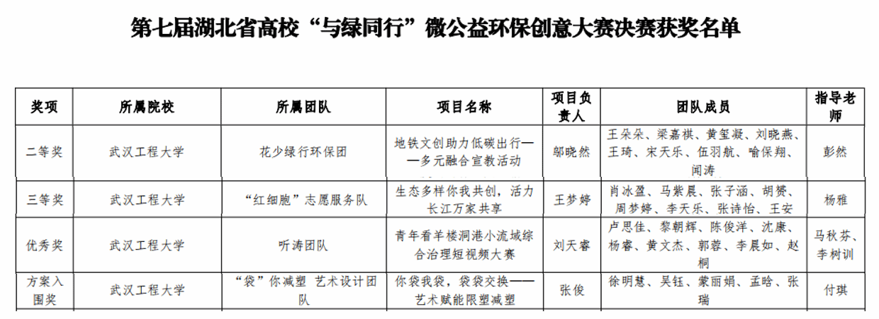 本网讯(通讯员 杨雅 王祥礼)近日,第七届湖北省高校“与绿同行”微公益环保创意大赛获奖名单公布,我校花少绿行环保团的《地铁文创助力低碳出行——多元融合宣教活动》项目荣获二等奖、“红细胞”志愿服务队的《生态多样你我共创,活力长江万家共享》项目荣获三等奖、听涛团队的《青年看羊楼洞港小流域综合治理短视频大赛》项目荣获优秀奖、“袋”你减塑艺术设计团队的《你袋我袋,袋袋交换——艺术赋能限塑减塑》项目荣获方案入围奖。