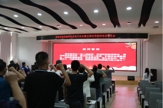 本网讯(通讯员 李梓煜)10月10日下午,管理学院举办师德师风宣教月活动暨全国优秀教师宣讲报告会,学院领导班子成员、全体教职工参会,会议由管理学院党委副书记罗琼主持。