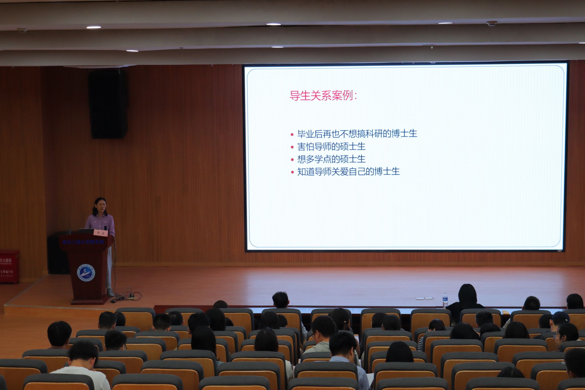 本网讯(通讯员 李茜)10月17日下午,我校在流芳校区图书馆二楼报告厅举办“如何避免导学关系的心理陷阱—研究生心理危机识别与干预”专题讲座。中国地质大学(武汉)学生心理健康教育中心郭兰教授应邀作报告,党委研究生工作部部长、研究生院院长陈绪兵,研工部副部长张琼,研究生导师、班主任及辅导员代表参加活动。活动由党委研工部李茜主持。
