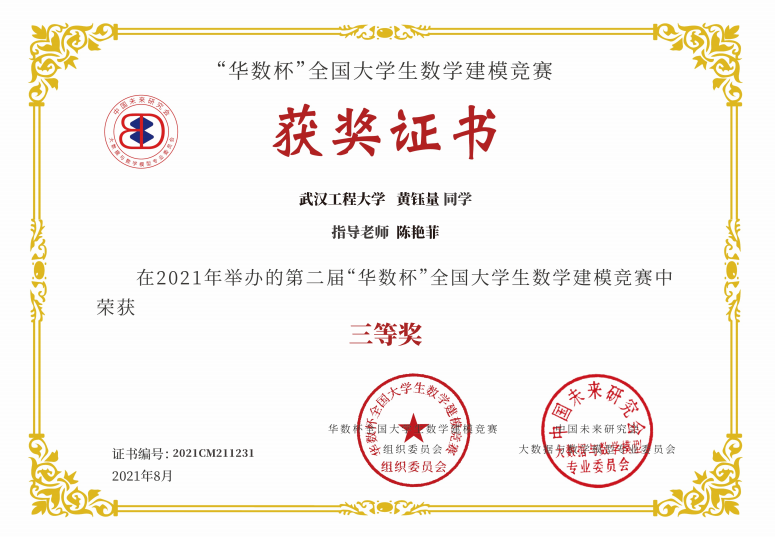 本网讯(通讯员 黄光亮)8月25日,由华数杯全国大学生数学建模竞赛组委会、中国未来研究会大数据与数据模型专业委员会主办的第二届“华数杯”全国大学生数学建模竞赛公布成绩。由电气信息学院研究生黄钰量、周超、光能数理学院马琳琳组成的团队在该项比赛中荣获全国三等奖。