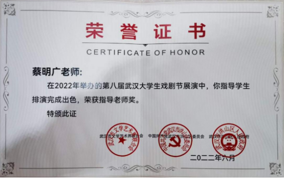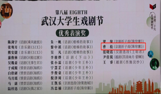 其中,蔡明广老师指导学生排演完成出色荣获“指导老师奖”,曹松同学在演出中表现出色荣获“优秀表演奖”。