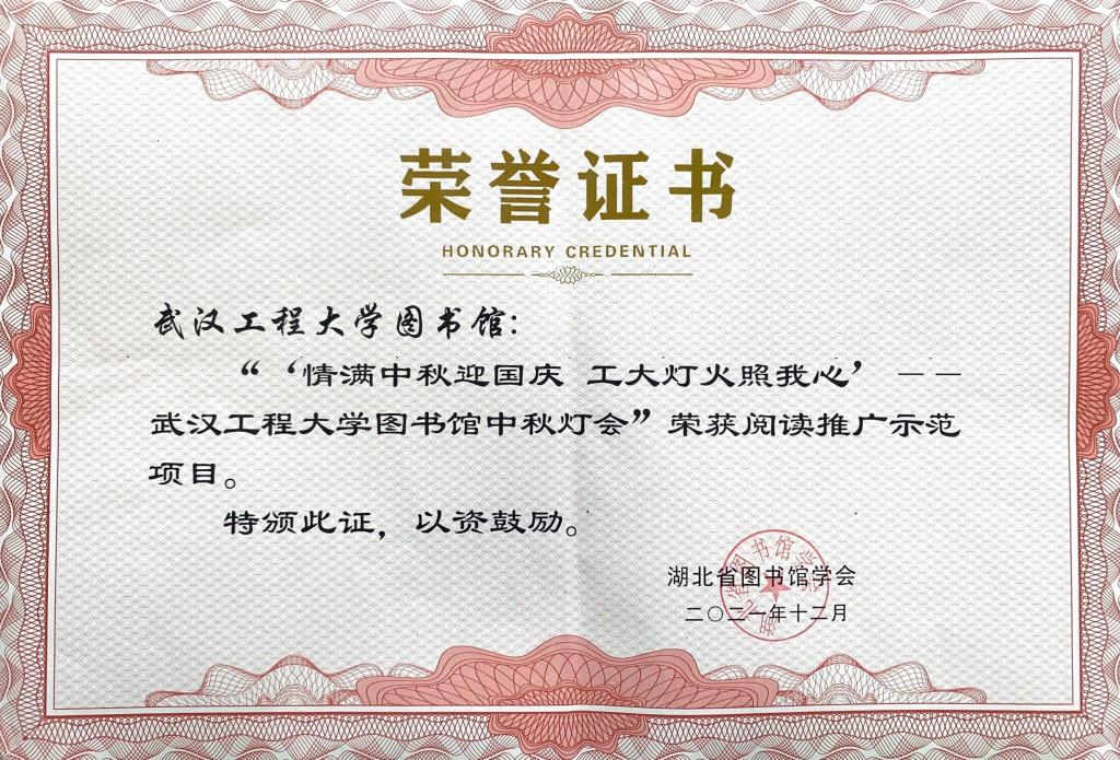 本网讯(通讯员 范玉璟)近日,湖北省2021年度全民阅读推广示范项目评选结果揭晓,我校图书馆“情满中秋迎国庆,工大灯火照我心”中秋灯会活动荣获“阅读推广示范项目”称号。