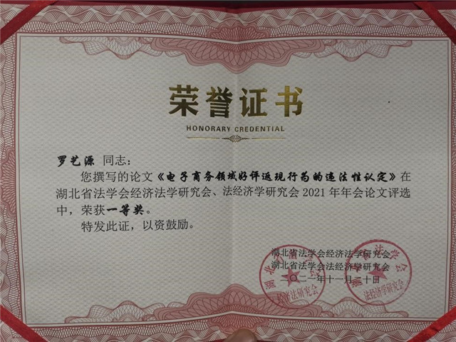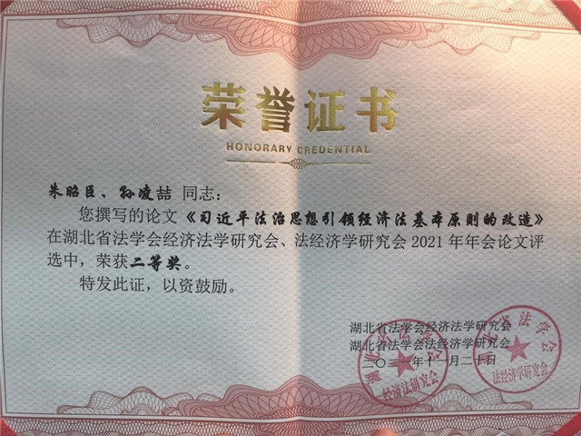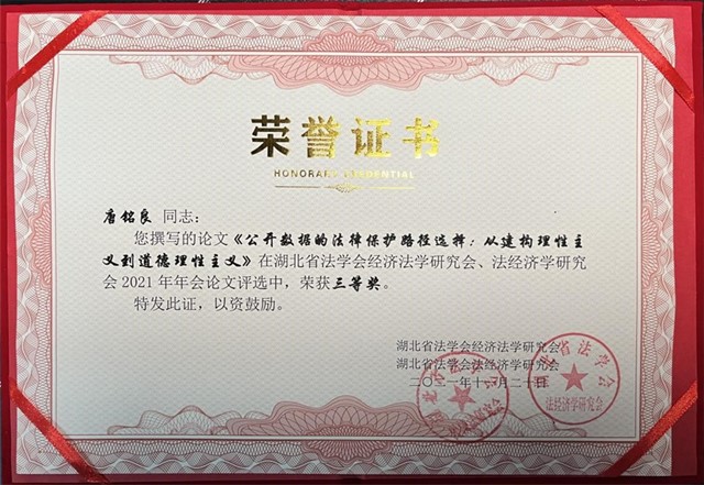 经专家评审,学院2019级法律硕士罗艺源撰写的《电子商务领域好评返现行为的违法性认定》荣获大会论文一等奖;2019级法律硕士朱昭臣和2020级法律硕士孙凌喆撰写的《习近平法治思想引领经济法基本原则的改造》荣获大会论文二等奖;2019级经济法学硕士唐铭良撰写的《公开数据的法律保护路径选择:从建构理性主义到道德理性主义》荣获大会论文三等奖。(审稿 杨克平)