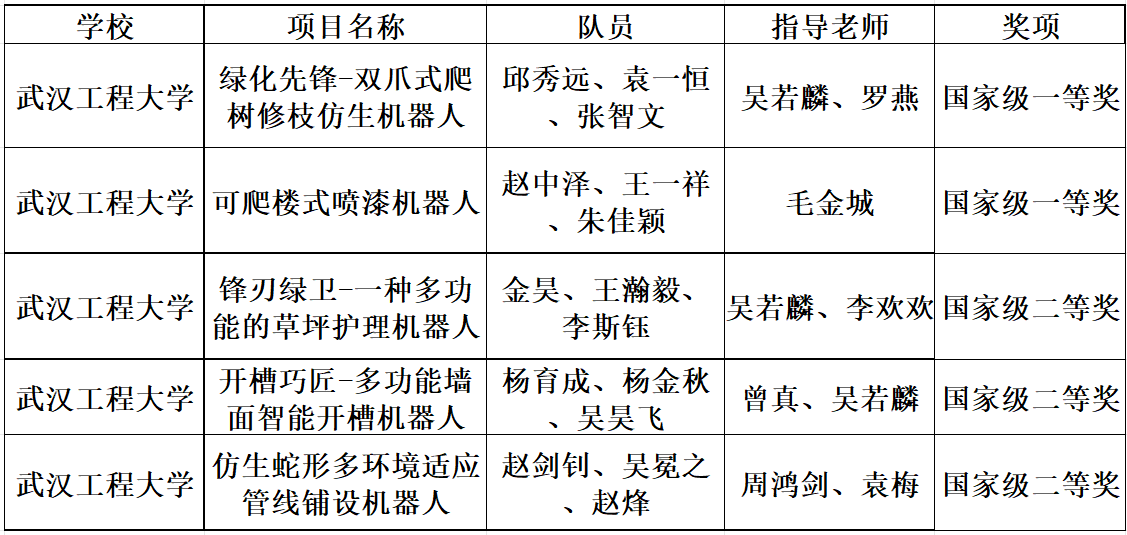 由机电工程学院吴若麟和罗燕老师指导的本科生邱秀远、袁一恒、张智文的《绿化先锋——双爪式爬树修枝仿生机器人》和毛金城老师指导的本科生赵中泽、王一祥、朱佳颖的《可爬楼式喷漆机器人》斩获国家级一等奖;吴若麟和李欢欢老师指导的作品《锋刃绿卫——一种多功能的草坪护理机器人》、曾真和吴若麟老师指导的作品《开槽巧匠——多功能墙面智能开槽机器人》、周鸿剑和袁梅老师指导的作品《仿生蛇形多环境适应管线铺设机器人》分别荣获国家级二等奖。