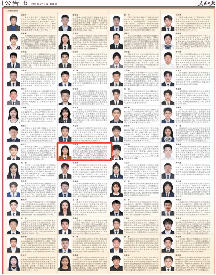 本网讯(通讯员 曾峥 汤曦)5月4日,《人民日报》专版刊登《2023—2024学年度本专科生国家奖学金获奖学生代表名录》,展示了100名本专科生国家奖学金获奖学生代表风采。我校化工与制药学院2021级学生宫咪雪从全国12万本专科生国家奖学金获得者中脱颖而出,入选名录。