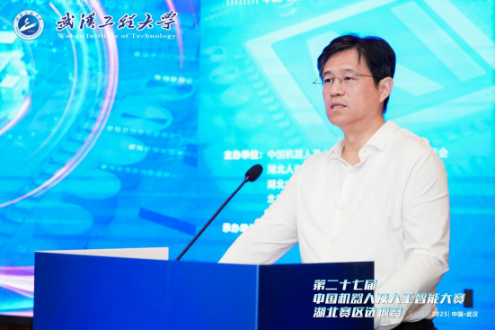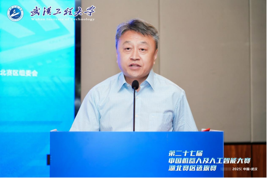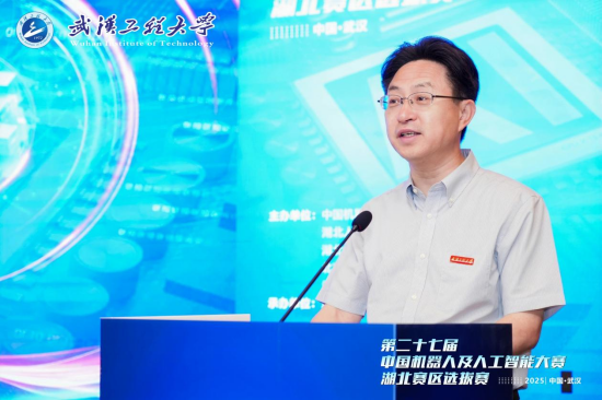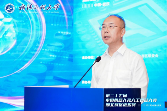 开幕式上,张彦铎介绍了学校基本情况、办学特色以及在培养创新人才、推动科技创新提质增效方面所取得的成绩。他回顾了我校在机器人与人工智能领域的深厚积淀,包括创建湖北省首支机器人足球队并14次荣获世界冠军,与烽火联合研发获奖的5G智能巡检机器人,以及在智慧化工、智慧矿山等领域的产学研成果。他强调,学校高度重视数字化建设和学生创新能力培养,2024年获批牵头成立湖北人工智能学院,为广大青年学子搭建科技创新与实践的平台。作为承办方,学校将全力做好赛事服务,搭建平台,助力学生把握“数字智能”趋势,为湖北打造科创高地贡献力量。