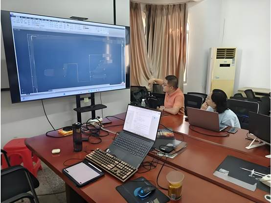在展示交流环节,李飞阔详细查看各参赛队伍的设计作品,指出图纸中存在的问题和不足,耐心解答了同学们参赛过程中存在的疑问,给出了详细具体的修改意见和解决措施。