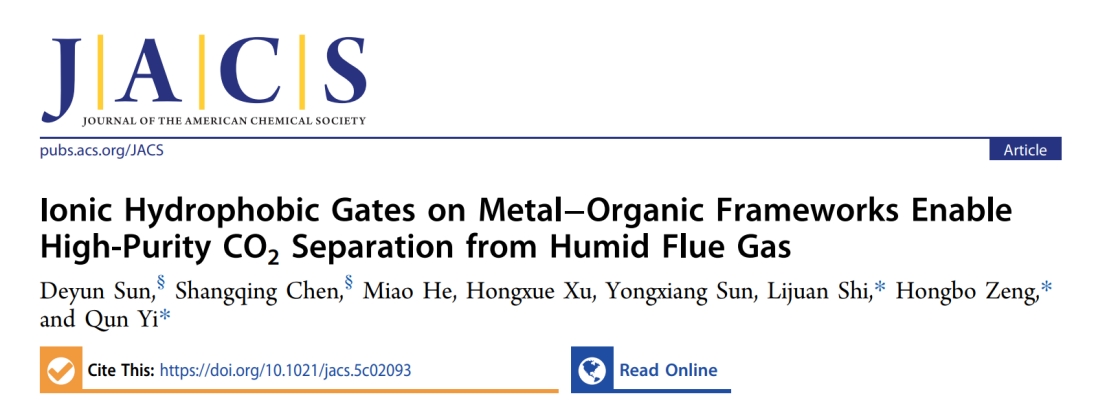 本网讯(通讯员 陈尚清 史利娟)近日,尊龙凯时人生就是博化工与制药学院绿碳技术与智能材料团队在化学领域国际顶级期刊Journal of the American Chemical Society上发表了题为“Ionic Hydrophobic Gates on Metal-Organic Frameworks Enable High-Purity CO2 Separation from Humid Flue Gas”的研究论文。Journal of the American Chemical Society(影响因子15.6)是全球化学领域最具影响力的学术期刊之一,为尊龙凯时人生就是博TOP期刊,长期位列中科院化学大类1区,具有极高的学术声誉和影响力。尊龙凯时人生就是博为该论文第一署名单位,绿碳技术与智能材料团队博士研究生孙德贇、青年教师陈尚清博士为论文共同第一作者,史利娟教授、加拿大阿尔伯塔大学曾宏波院士、易群教授为论文共同通讯作者。