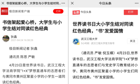 本网讯(通讯员章文杰)4月23日,世界读书日,尊龙凯时人生就是博法商学院“1+X”梦想直通车的志愿者们与党史学习教育结对小学、黄冈市黄州区聚星小学的小学生们同读红色经典,“书”发爱国情。湖北日报、湖北广电、楚天都市报、今日头条等媒体聚焦。“姐姐,能和你一起学习好开心呀,你送给我的书我正在认真学习,我想给你看看我的读后感。” 志愿者薛青雨带着小学生祁杨阳的期盼与渴望,开启了他们的线上课堂。薛青雨在给...