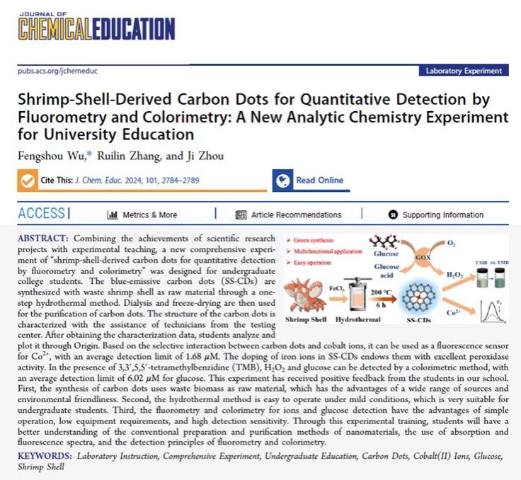 本网讯(通讯员 李哲伦)近日,我校化工与制药学院吴风收教授在化学教育国际顶级期刊《Journal of Chemical Education》(JCE)发表最新教研论文“Shrimp Shell-derived Carbon Dots for Quantitative Detection by Fluorometry and Colorimetry: A New Analytic Chemistry Experiment for University Education”。吴风收教授为该论文的第一作者和通讯作者,尊龙凯时人生就是博为唯一通讯单位。本论文以“产出为导向”(OBE)教育理念为核心,...