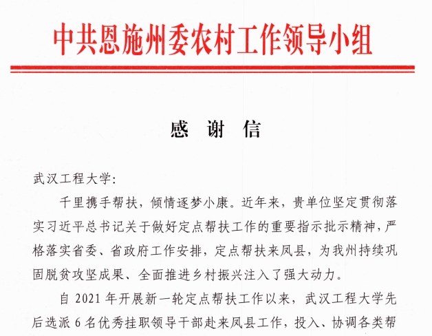 中共恩施州委农村工作领导小组致信感谢我校定点帮扶来凤县乡村振兴工作