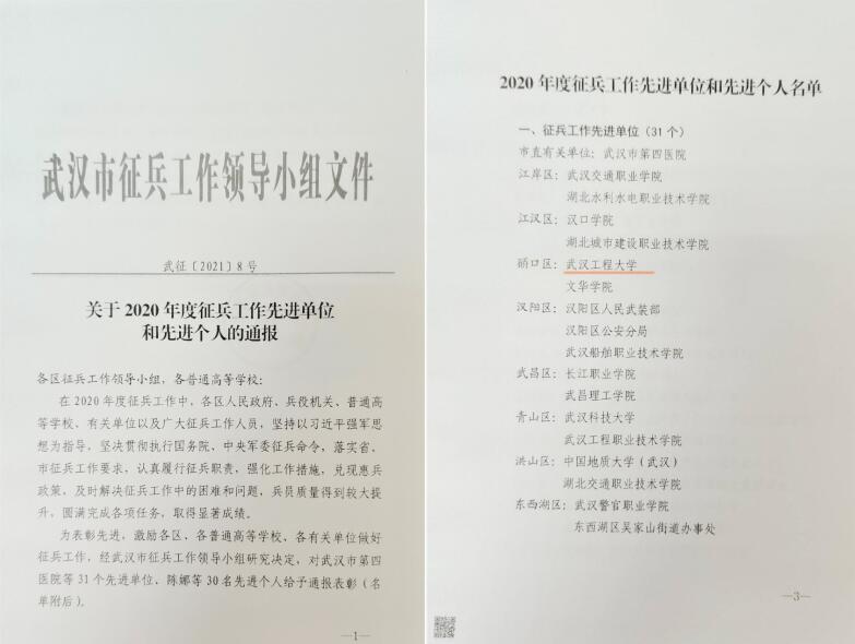 本网讯(通讯员谢晖)2020年1月,据武汉市征兵工作领导小组下发的《关于2020年度征兵工作先进单位和先进个人的通报》(武征[2021]8号),我校喜获2020年度征兵工作先进单位,这也是我校首次获该项工作市级表彰。 ?2020年我校共有87名学生光荣入伍,同比增长10%。其中应届毕业生26人,占比30%;女生12人,女生的走兵率位于武汉高校前列。2020年由于疫情影响,针对线下无法开展,异地体检政策不一,政审、学费代偿等手...