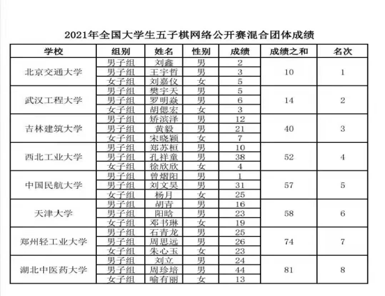 本网讯(通讯员 乐建军)2022年1月1日,由国家体育总局棋牌运动管理中心为指导单位,天津市体育竞赛和社会体育事务中心、天津棋院主办,天津市围棋运动协会承办的2021年全国大学生五子棋网络公开赛落下帷幕。全国包括北京交通大学、天津大学,中国民航大学、西安交通大学等四十余所高校参加了本次比赛。我校派出了以范东芳为领队、乐建军为教练、8名学生组成的五子棋队,经过一天紧张而又激烈的角逐,最终获得全国大学生...