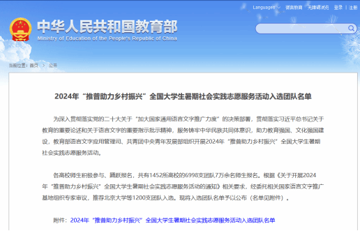 外语学院“语你同行”志愿服务队入选2024年“推普助力乡村振兴”全国大学生暑期社会实践志愿服务活动团队