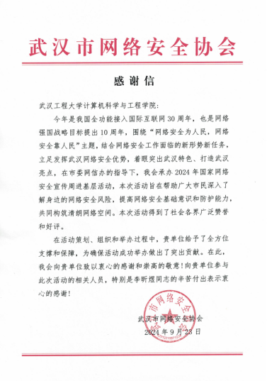 本网讯(通讯员 昌檀)近日,计算机科学与工程学院人工智能学院获武汉市网络安全协会的感谢信,感谢计算机学院在2024年国家网络安全周进基层活动中,给予的全方位支撑和保障,为活动成功举办所做的突出贡献。感谢信中特别致谢了学院网络空间安全专业李昕煜老师的辛苦付出。 武汉市网络安全协会是民政部门认定的AAAA级社会组织;中国网络社会组织联合会、中国网络空间安全协会和中国网络安全产业联盟正式成员单位,成立了华中第一个智能汽车网络安全专业委员会、...