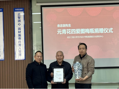本网讯(通讯员 赵鹏捷 孙雪洁)3月6日,“元青花四爱图梅瓶(复刻)及钧花釉瓷瓶”捐赠仪式在艺术设计学院举行。由“景德镇手工制瓷技艺”传承人余志剑先生精心制作的“元青花四爱图梅瓶(复刻)”,以及由陶瓷艺术家牛帅宇先生创作的“钧花釉瓷瓶”两件艺术品,赠予学院湖泗窑文化研究中心用于教学与研究。此次捐赠活动由湖泗窑文化研究中心特聘专家、客座教授、原武汉瓷厂技术部主任施占杰先生牵头促成。艺术设计学院党委书记夏志敏、...