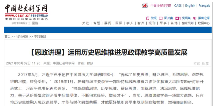 《中国社会科学网》刊发我校马院教师颜欣博士理论文章《运用历史思维推进思政课教学高质量发展》
