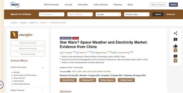 本网讯(通讯员 尤喆)近日,法商学院2018级本科生吴桐同学在学院青年教师付书科、尤喆,龚梦琪和中国地质大学(武汉)成金华等多名老师共同指导下,完成一篇题为“Star Wars? Space weather and electricity market: Evidence from China”的科研论文,并顺利发表在能源经济领域SCI期刊《Energies》上。本论文第一作者为本科生吴桐,通讯作者为尤喆老师。学院本科生在SCI期刊上发表学术论文,是学校本科生全程导师制的又一新成...